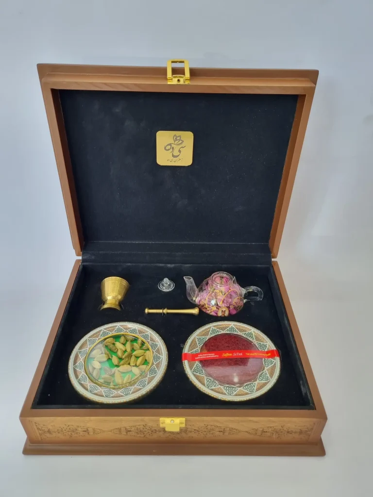 زعفران سوپر نگین ۱ مثقال + هل + گل محمدی ( پک چوبی )